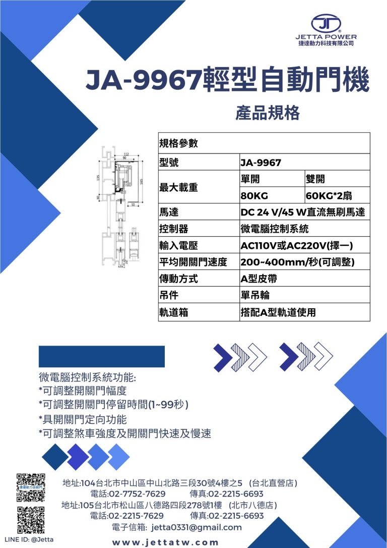 JA-9967 輕型玻璃自動門集結了平價與美觀,通用性極高,吊…